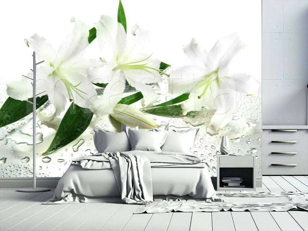 Бесшовные обои на стену: Лилии белые в капельках воды. Артикул: 10-365