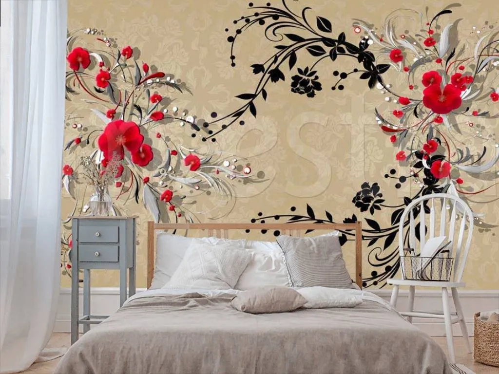Бесшовные обои на стену: Черно красные цветы 3д. Артикул: 7-214