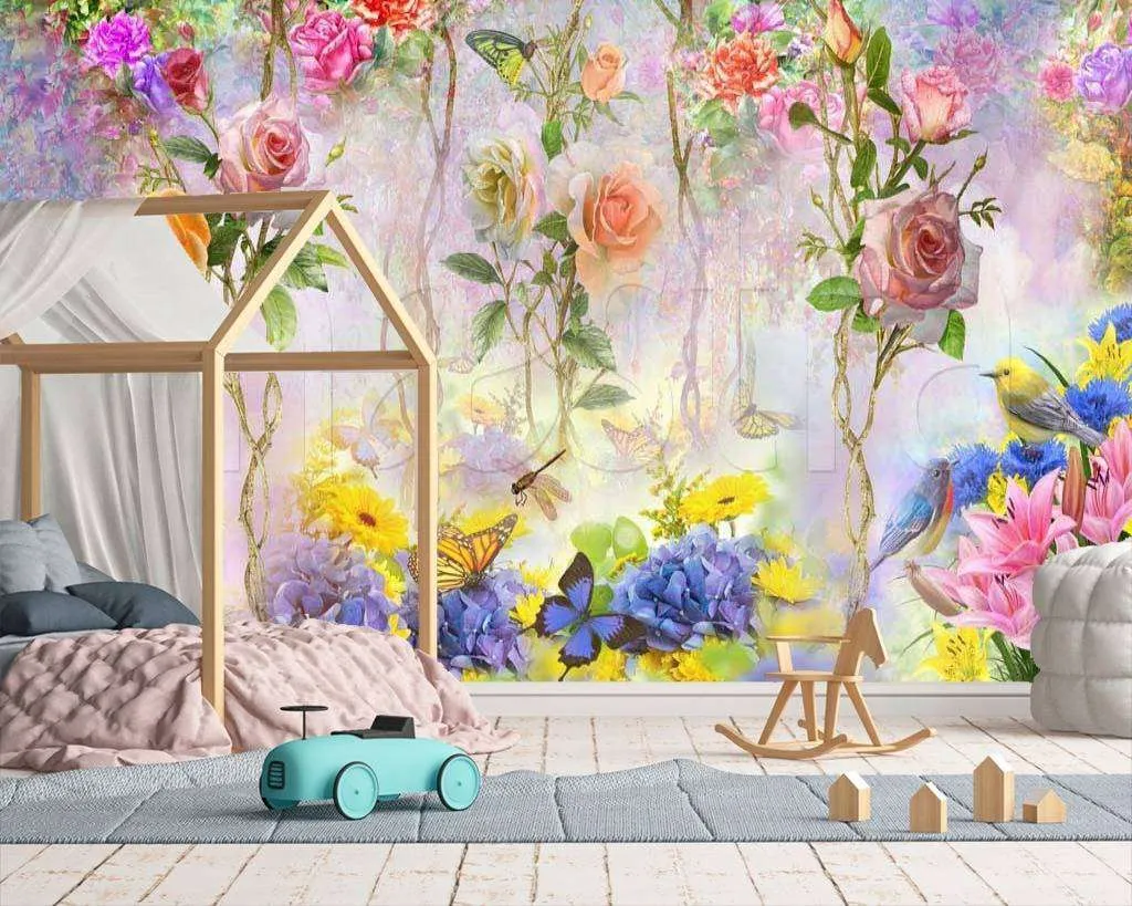 Бесшовные обои на стену: Цветы розы и птицы. Артикул: 7-312