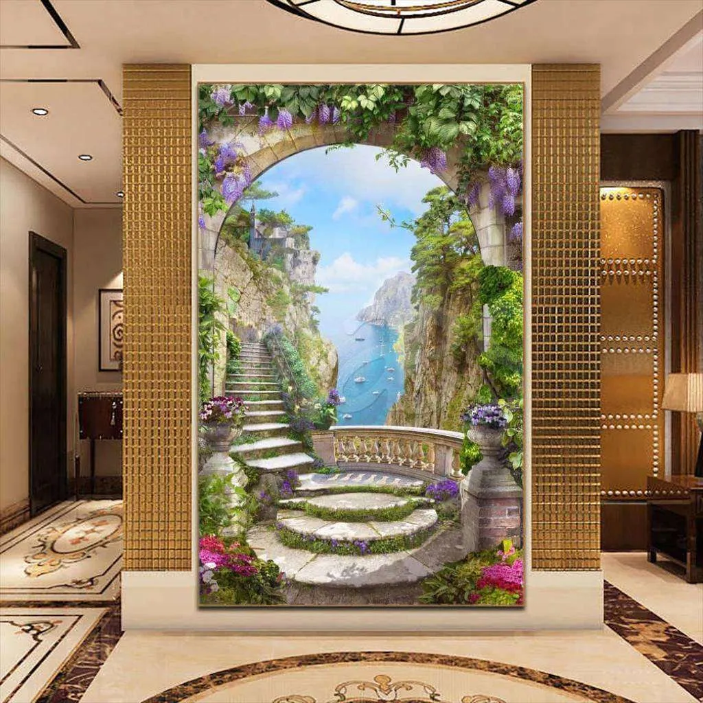 Бесшовные обои на стену: Старая арка с лестницей с видом на залив. Артикул: 7-316