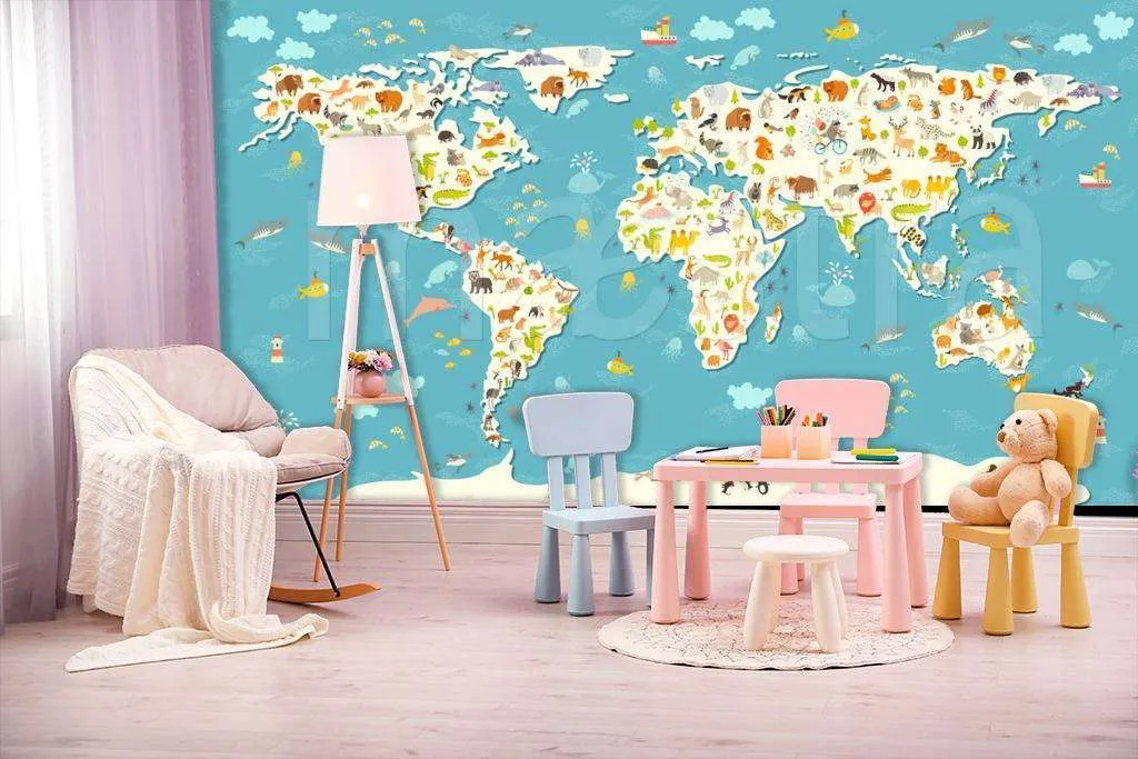 Бесшовные обои на стену: Карта мира и животные. Артикул: 12-517