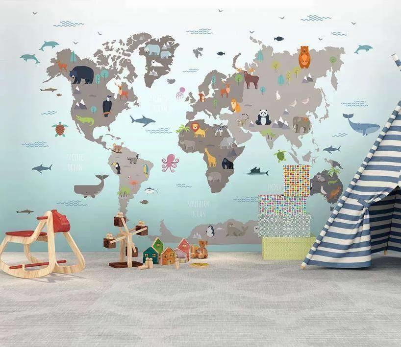 Бесшовные обои на стену: Карта мира и зверятки. Артикул: 15-205