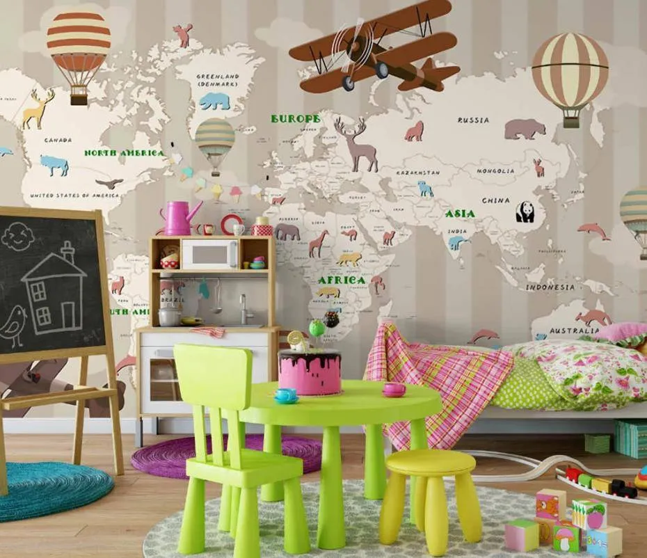 Бесшовные обои на стену: Карта мира с самолетами и шарами. Артикул: 15-314
