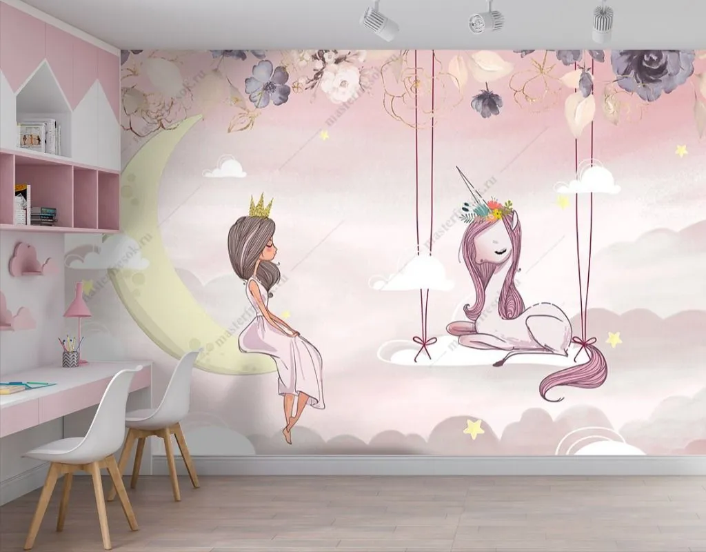 Бесшовные обои на стену: Фея в облаках с единорогом. Артикул: 14-444