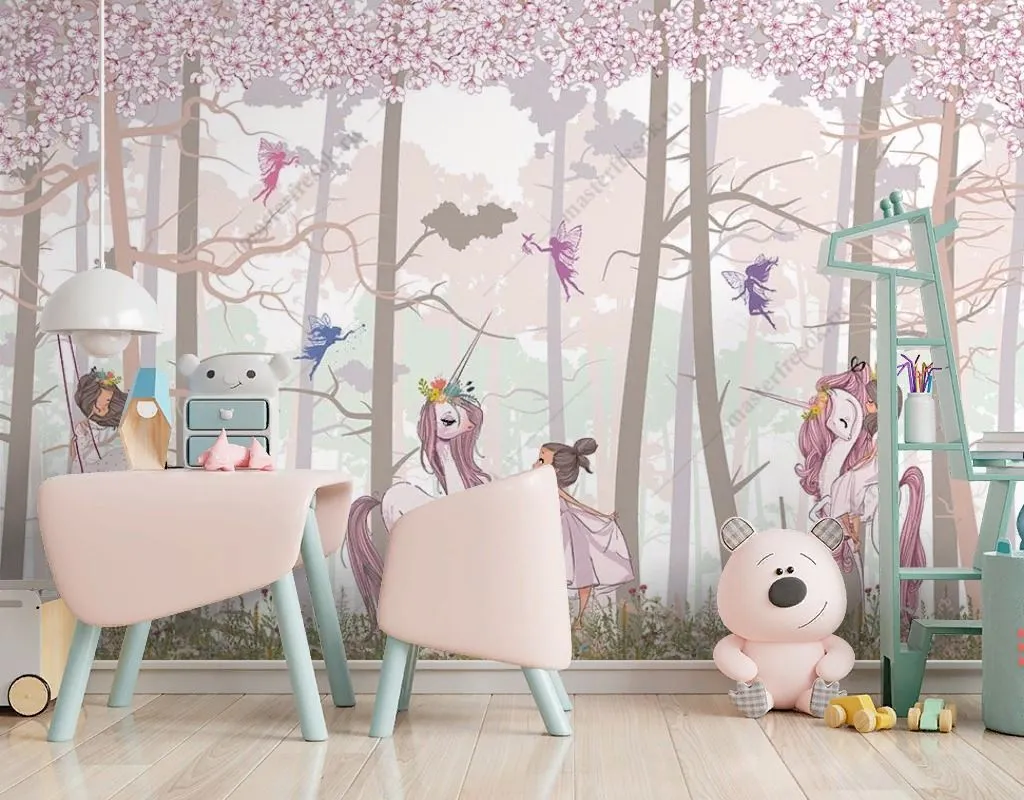 Бесшовные обои на стену: Принцесса и единорог в лесу. Артикул: 14-313