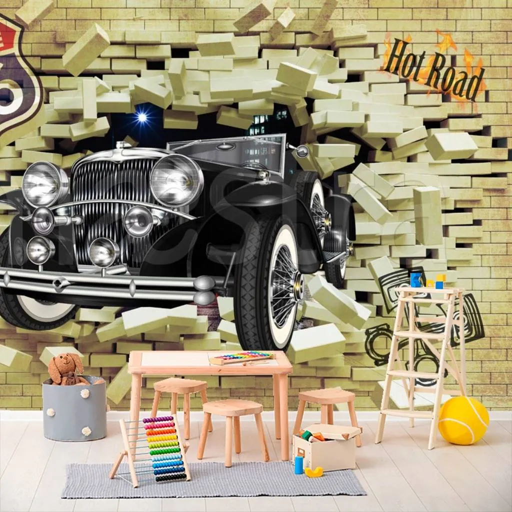 Бесшовные обои на стену: Ретро автомобиль выезжает из стены. Артикул: 12-385