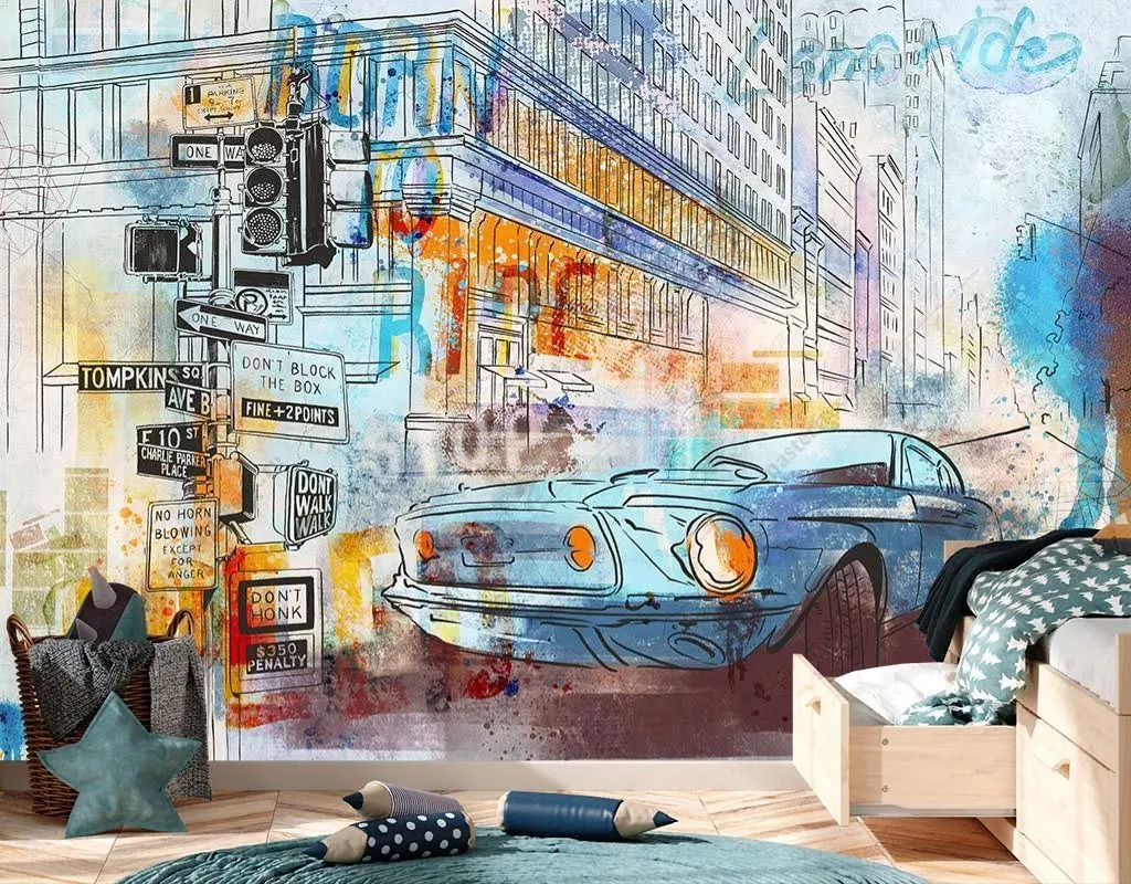 Бесшовные обои на стену: Машина графити акварель. Артикул: 12-1437
