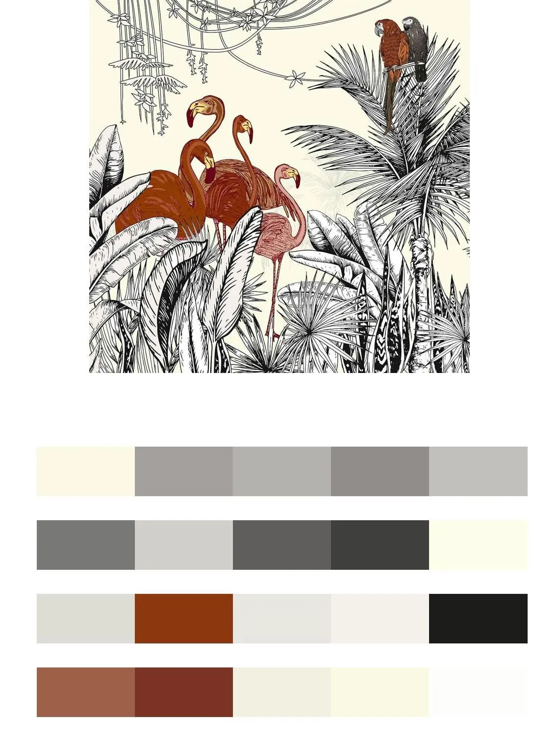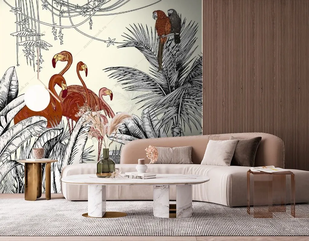 Бесшовные обои на стену: Фламинго и попугаи в тропиках. Артикул: 12-1548
