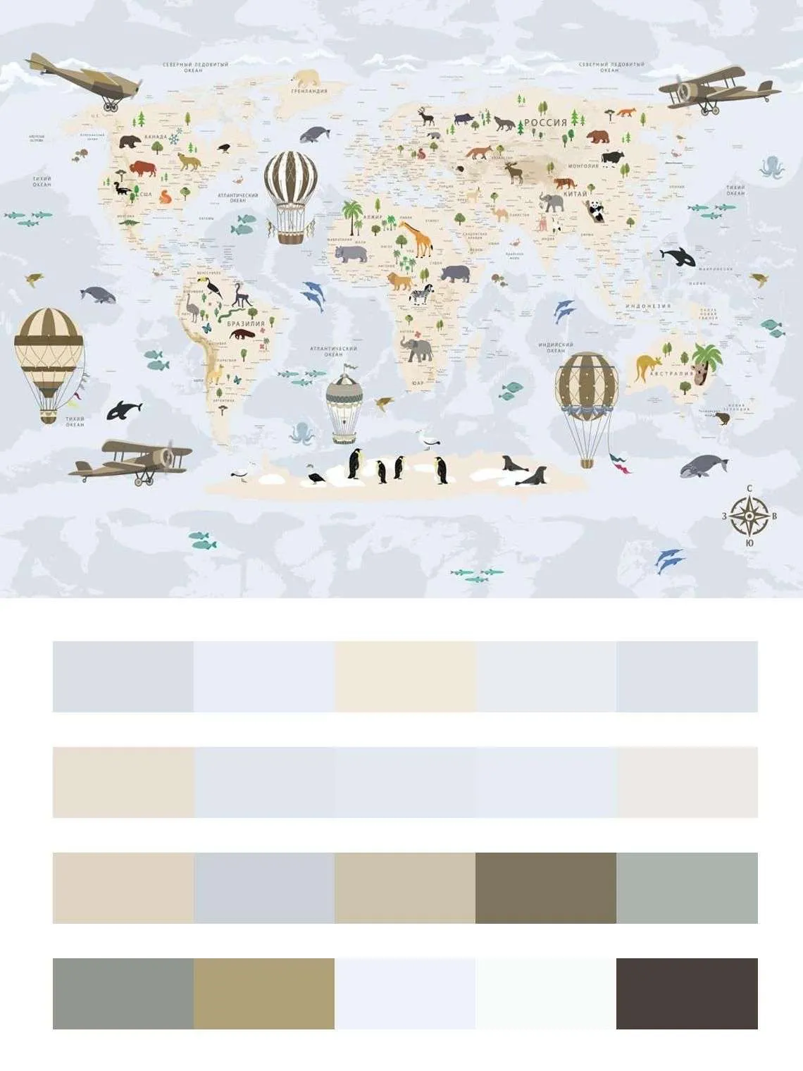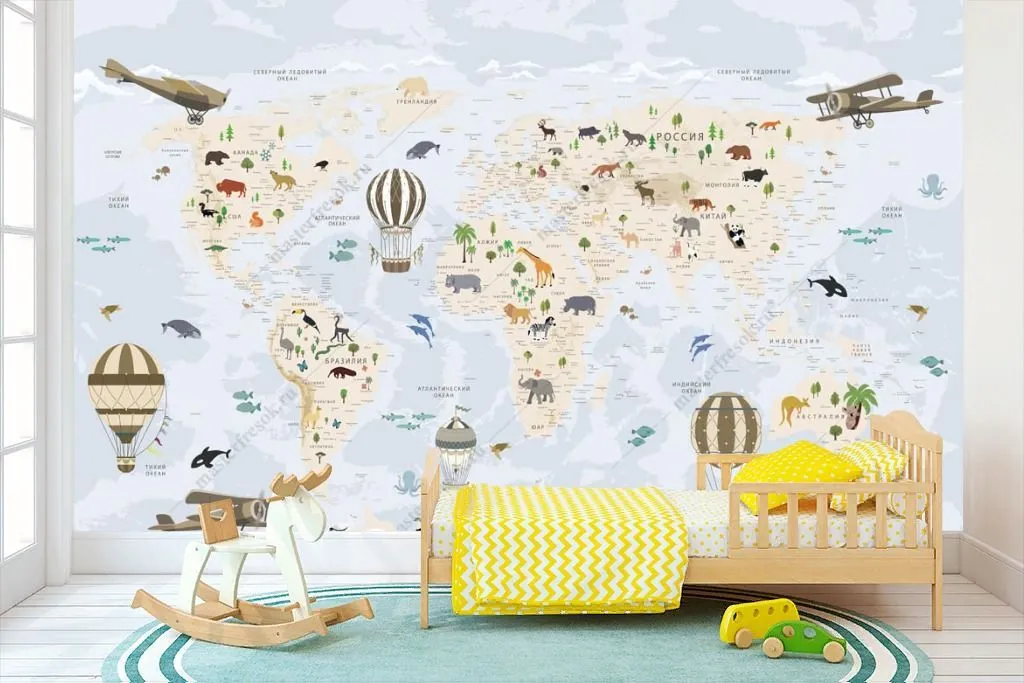 Бесшовные обои на стену: Детская карта с животными. Артикул: 12-1319