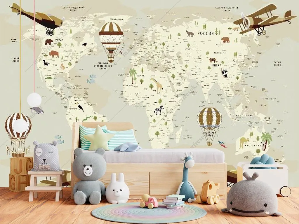 Бесшовные обои на стену: Карта детская с самолетами. Артикул: 14-674