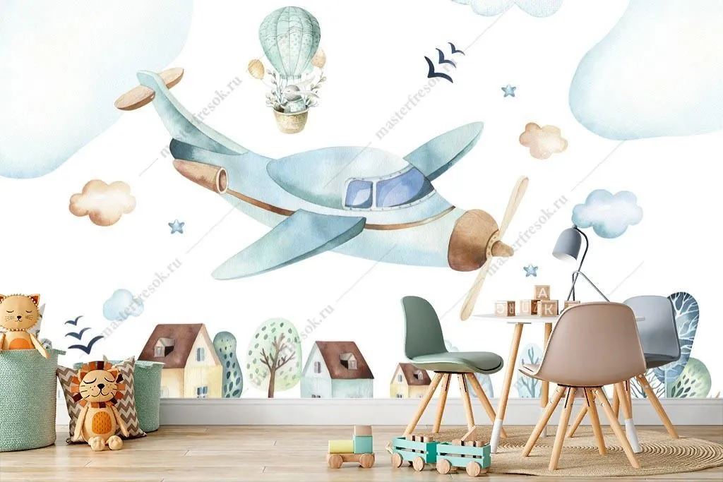 Бесшовные обои на стену: Самолетик над городом. Артикул: 14-506