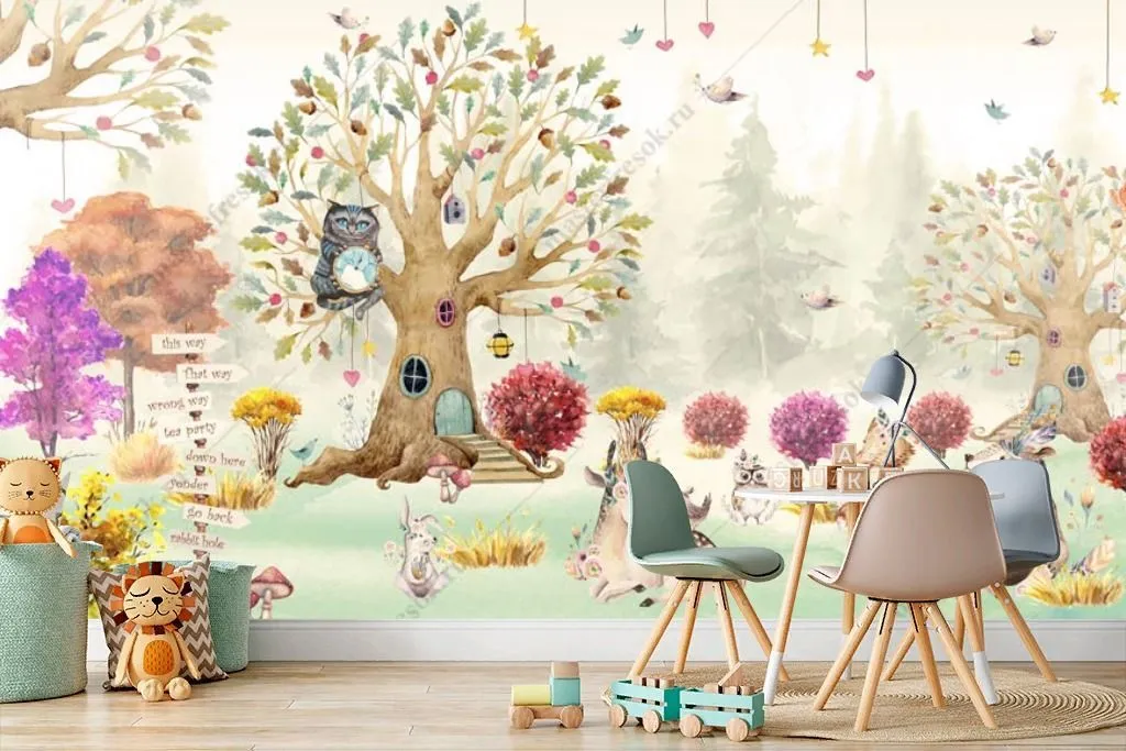 Бесшовные обои на стену: Красочный лес с животными. Артикул: 14-254