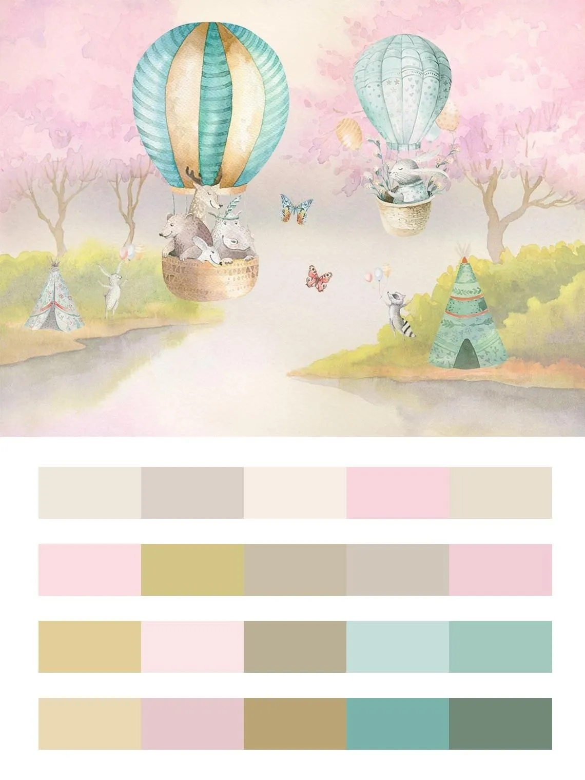 Бесшовные обои на стену: Акварельный лес с животными на воздушных шарах. Артикул: 14-315