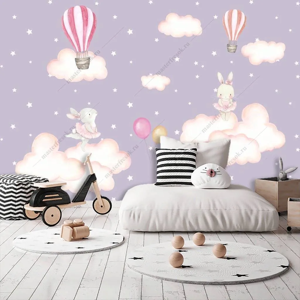 Бесшовные обои на стену: Зайки на облаках. Артикул: 12-1194