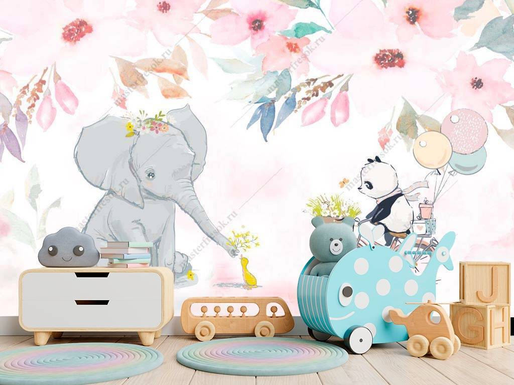Бесшовные обои на стену: Слоненок и медвежонок. Артикул: 14-019