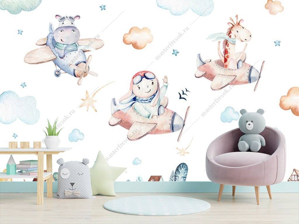 Бесшовные обои на стену: Зверята на самолете. Артикул: 14-092