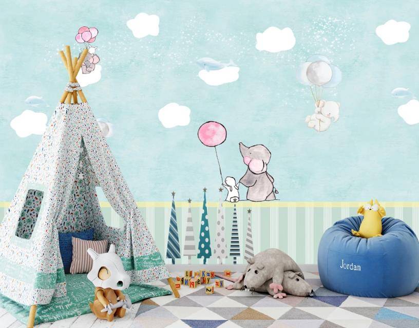 Бесшовные обои на стену: Воздушные шарики и три слоника. Артикул: 15-296