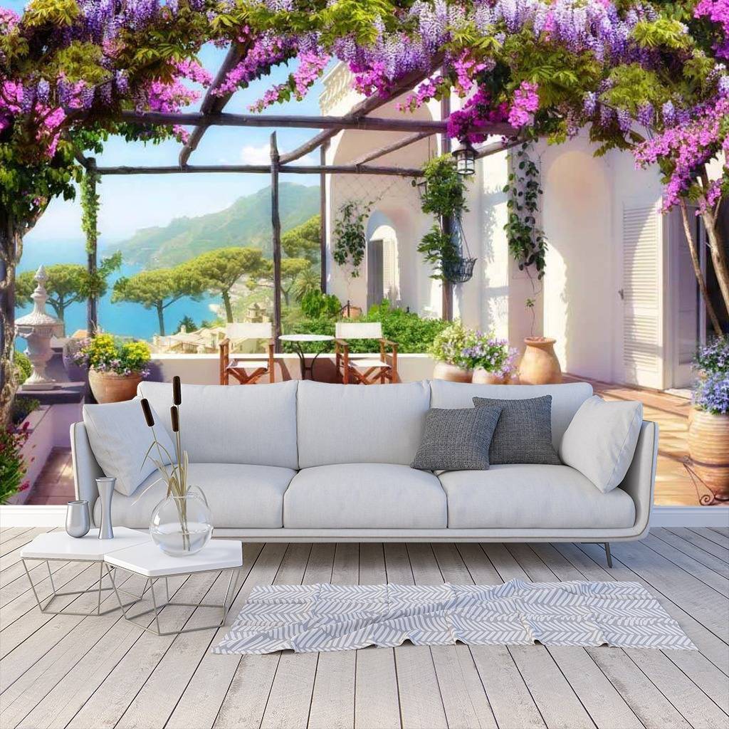 Бесшовные обои на стену: Сиреневые цветы на террасе. Артикул: 17-0120