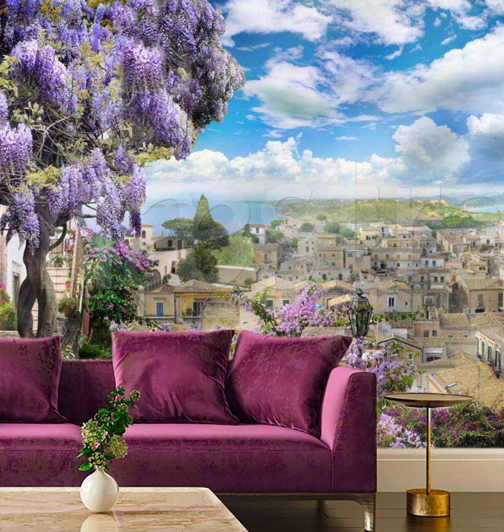 Бесшовные обои на стену: Дерево сирени с видом на город. Артикул: 7-086