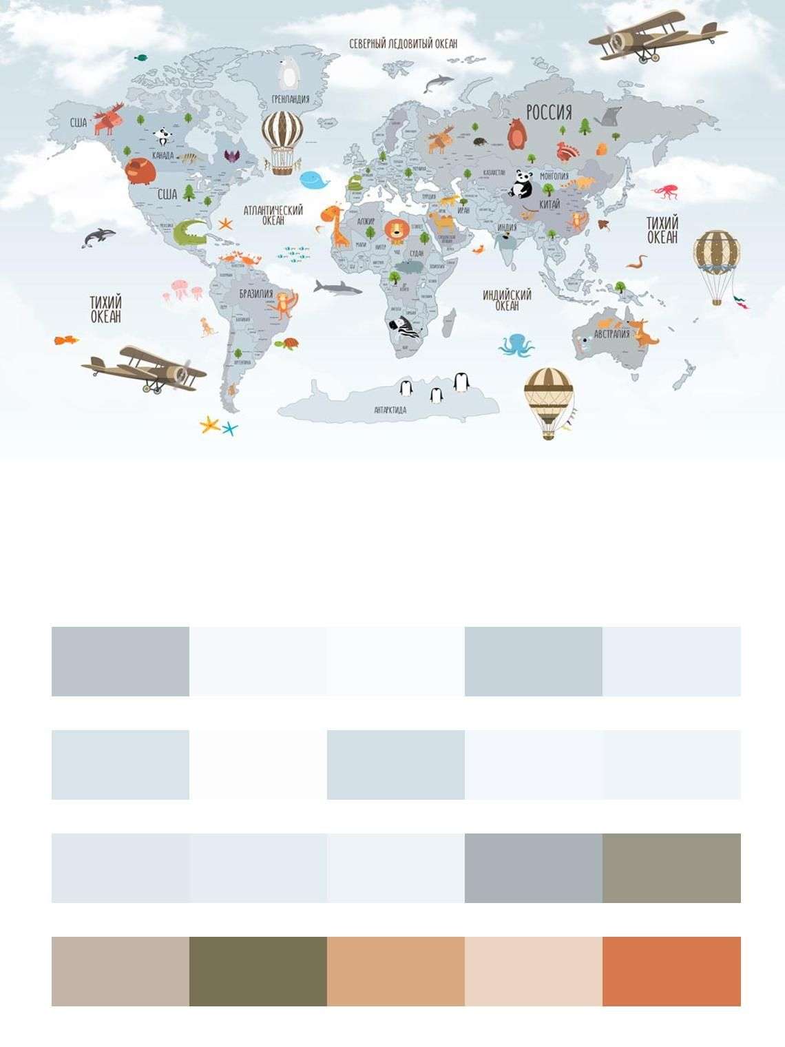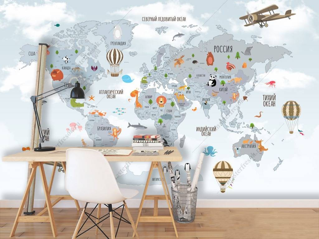 Бесшовные обои на стену: Карта мира детская с самолетами. Артикул: 12-968