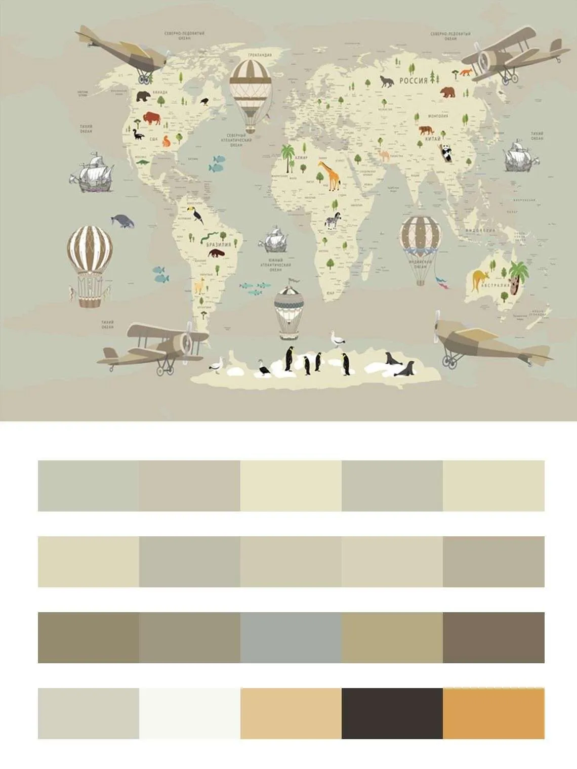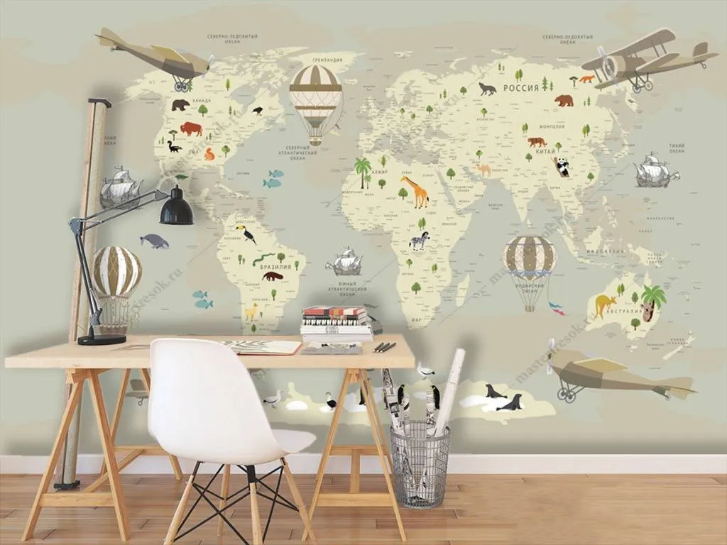 Бесшовные обои на стену: Карта мира детская бежевая. Артикул: 12-974