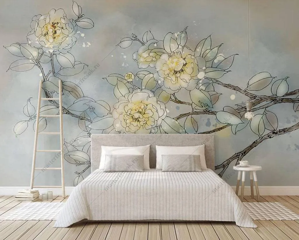 Бесшовные обои на стену: Объемные цветы на ветке. Артикул: 15-975