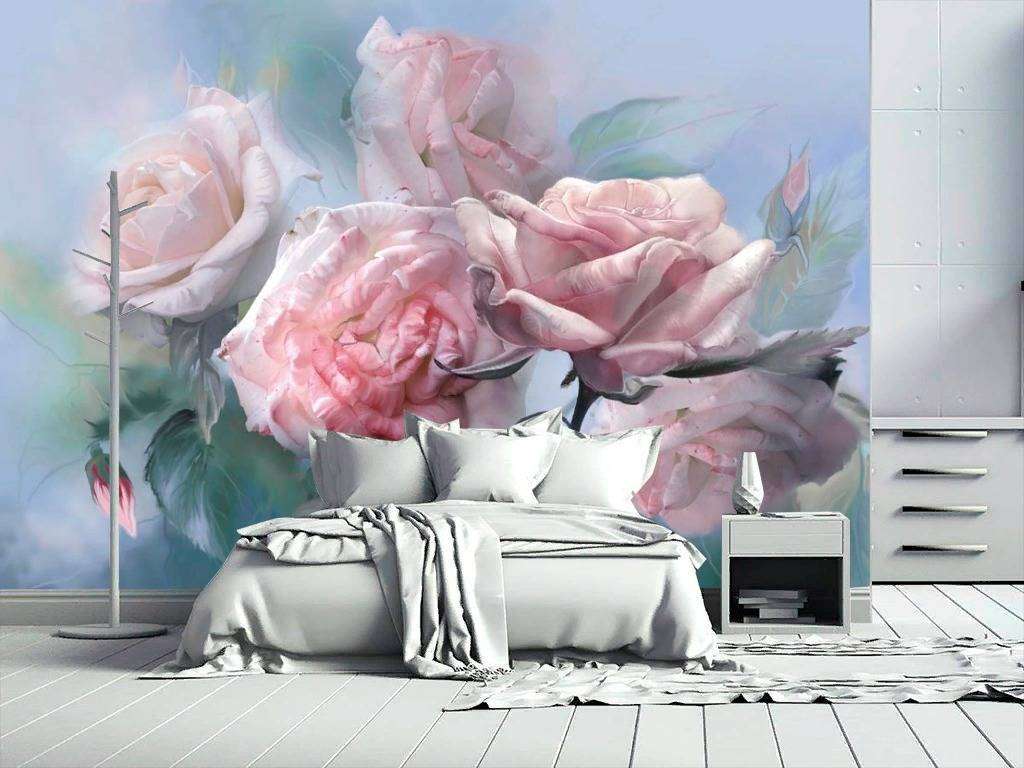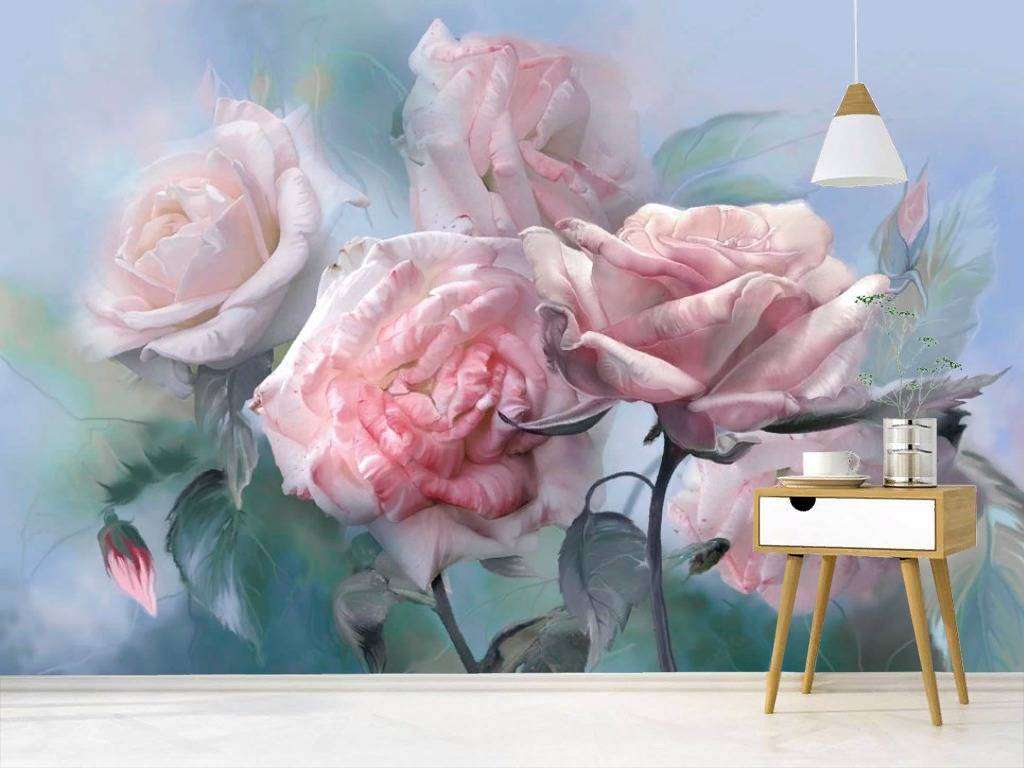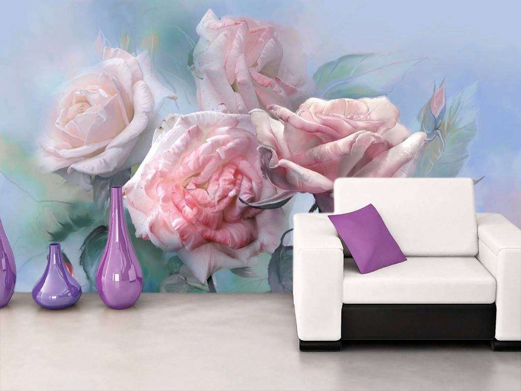 Бесшовные обои на стену: Розы на голубом фоне. Артикул: 13-265