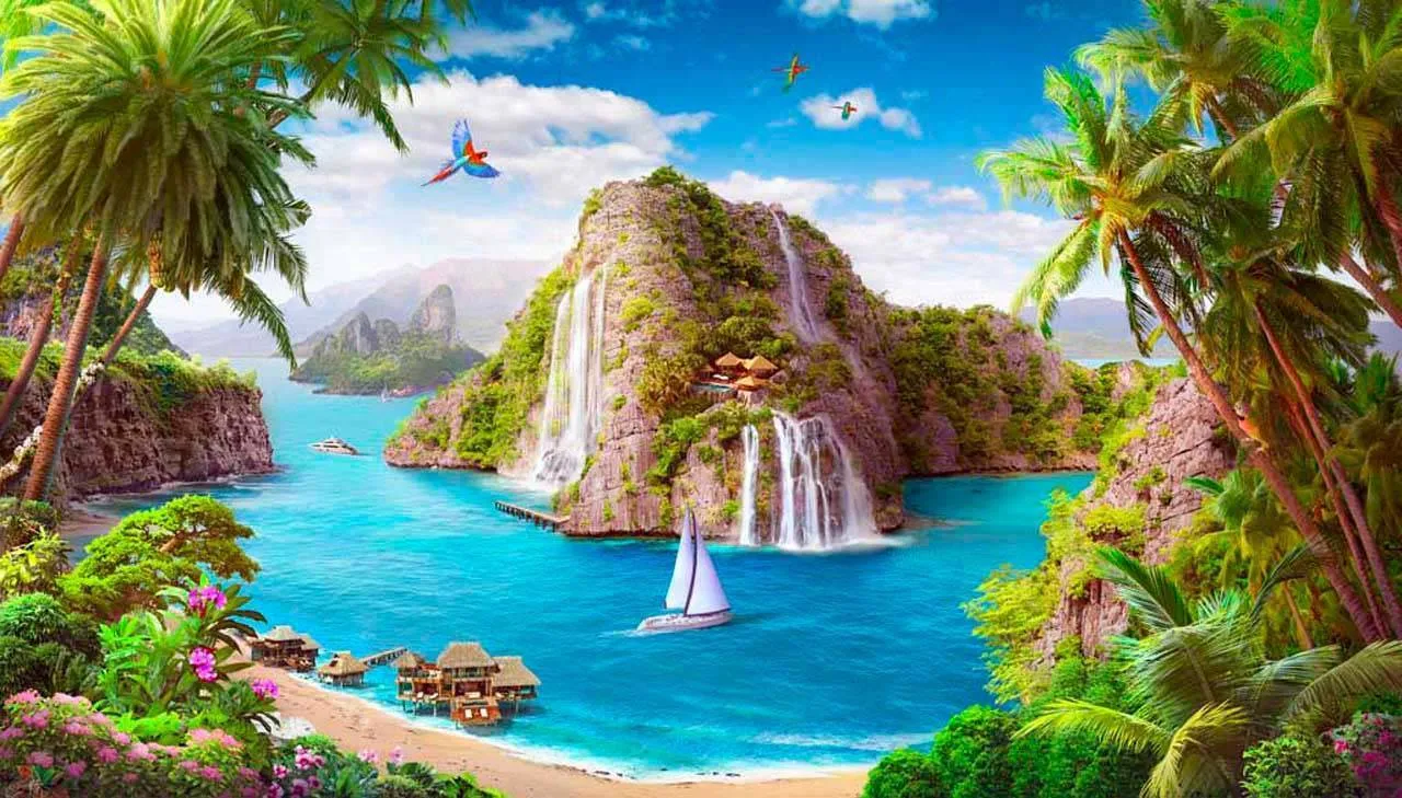 Бесшовные обои на стену: Вид на море и водопад на острове. Артикул: 11-158