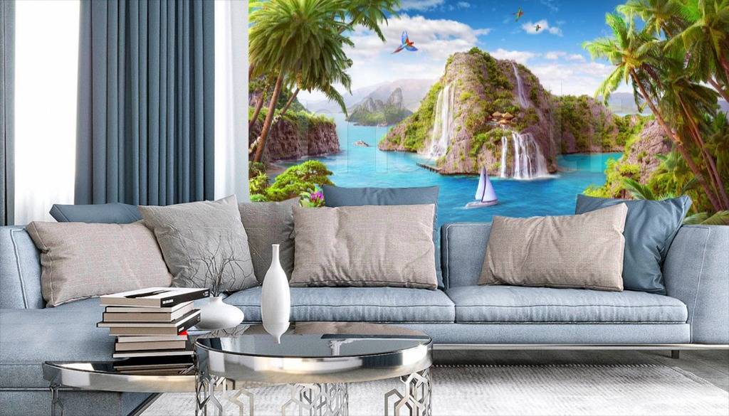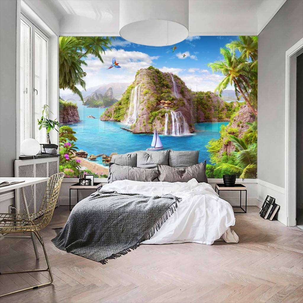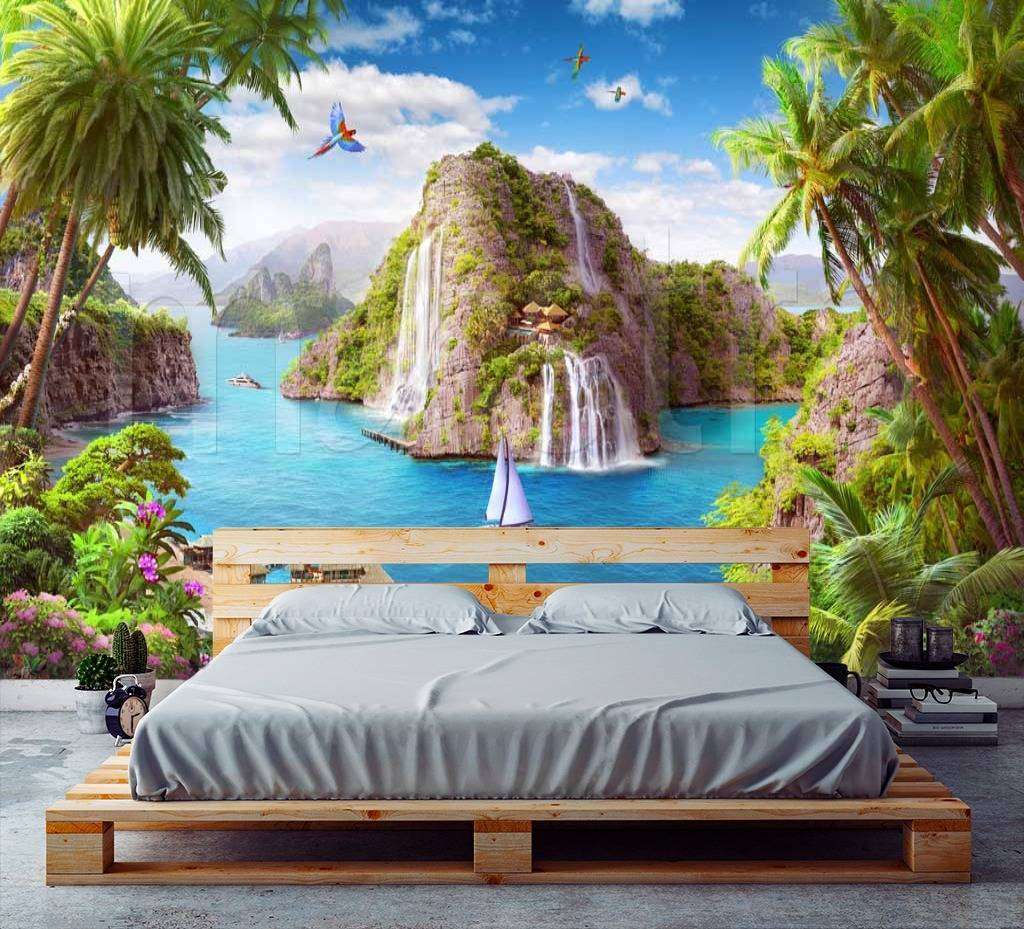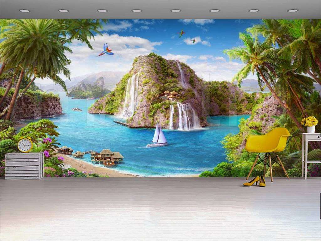 Бесшовные обои на стену: Вид на море и водопад на острове. Артикул: 11-158