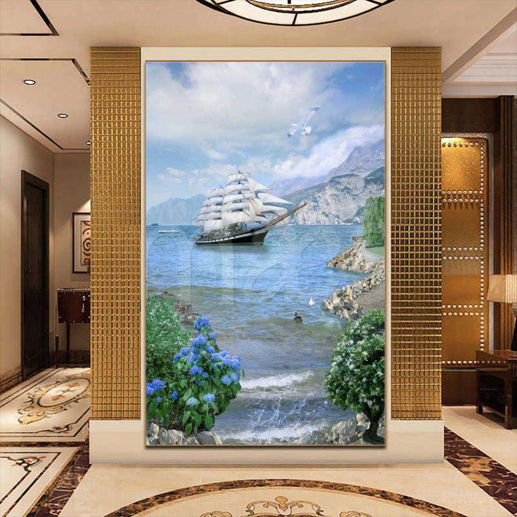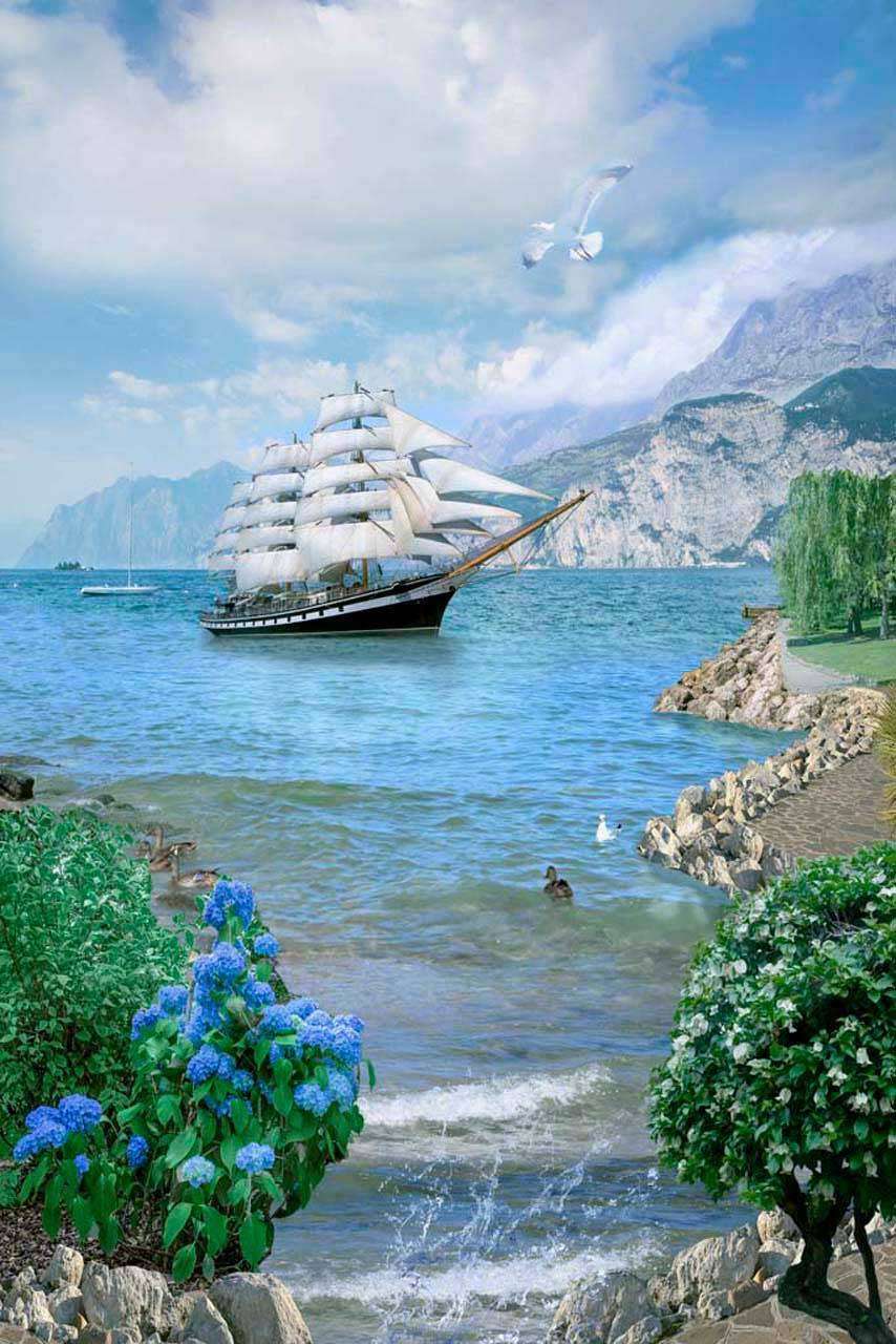 Бесшовные обои на стену: Вид с берега на корабль. Артикул: 7-189