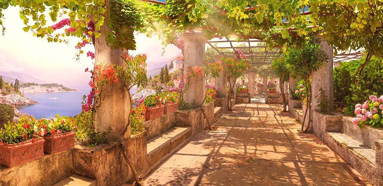 Бесшовные обои на стену: Пейзаж с колоннами и цветами. Артикул: 7-217