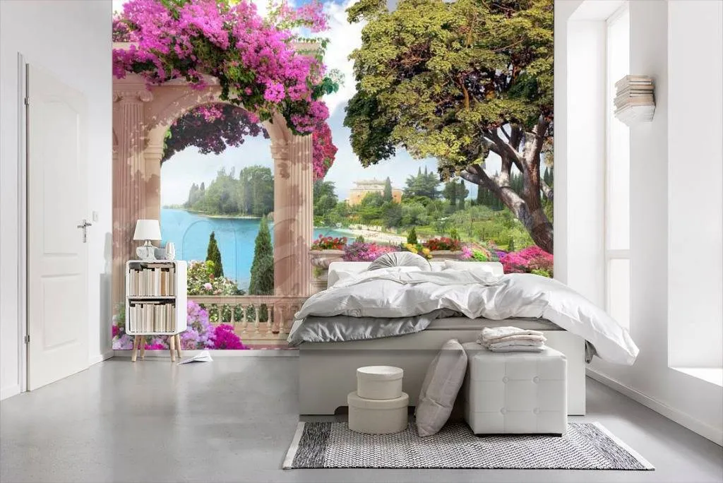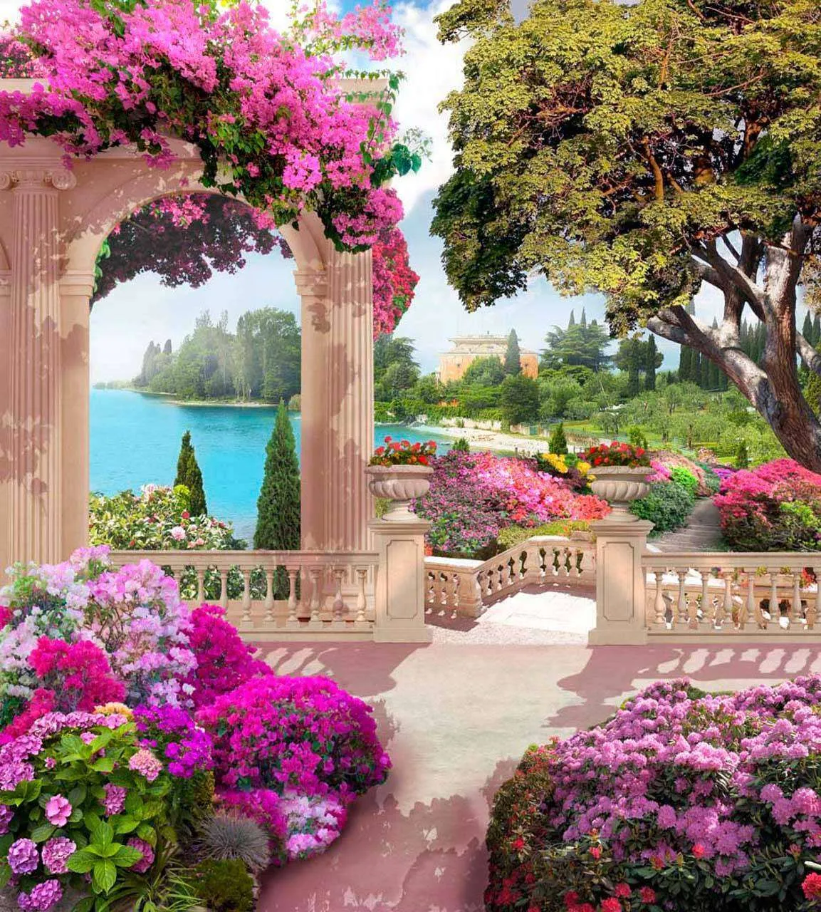 Бесшовные обои на стену: Терраса с розовыми цветами 2. Артикул: 7-125-2