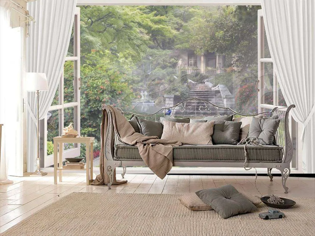 Бесшовные обои на стену: Окно с видом на парк, павлина и пруд. Артикул: 7-661