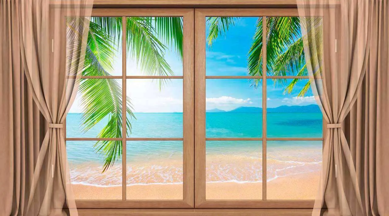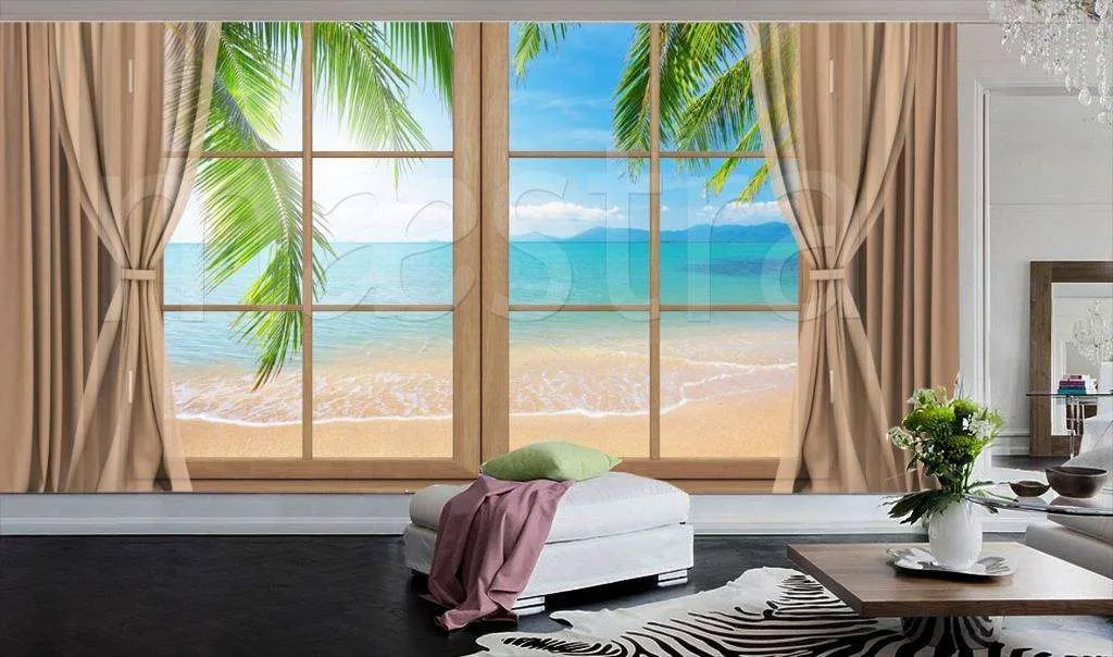 Бесшовные обои на стену: Окно с видом на пальмы и море. Артикул: 7-668