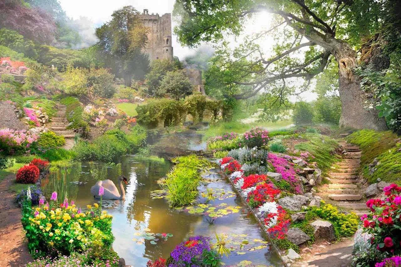 Бесшовные обои на стену: С видом на цветущий парк и пруд. Артикул: 7-028