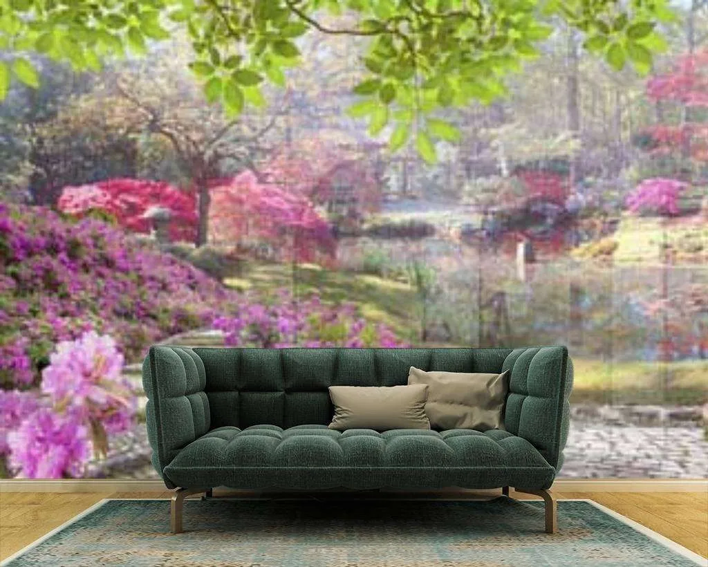 Бесшовные обои на стену: Панорама парк с розовыми цветами и прудом. Артикул: 7-155