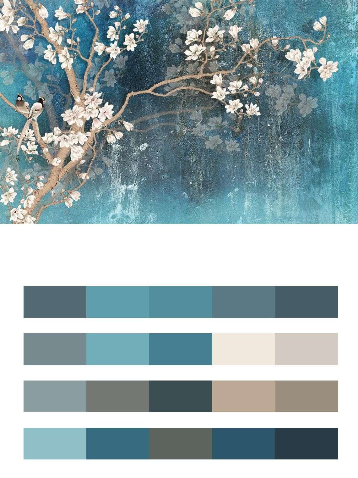 Бесшовные обои на стену: Сакура на бирюзовом фоне. Артикул: 14-311