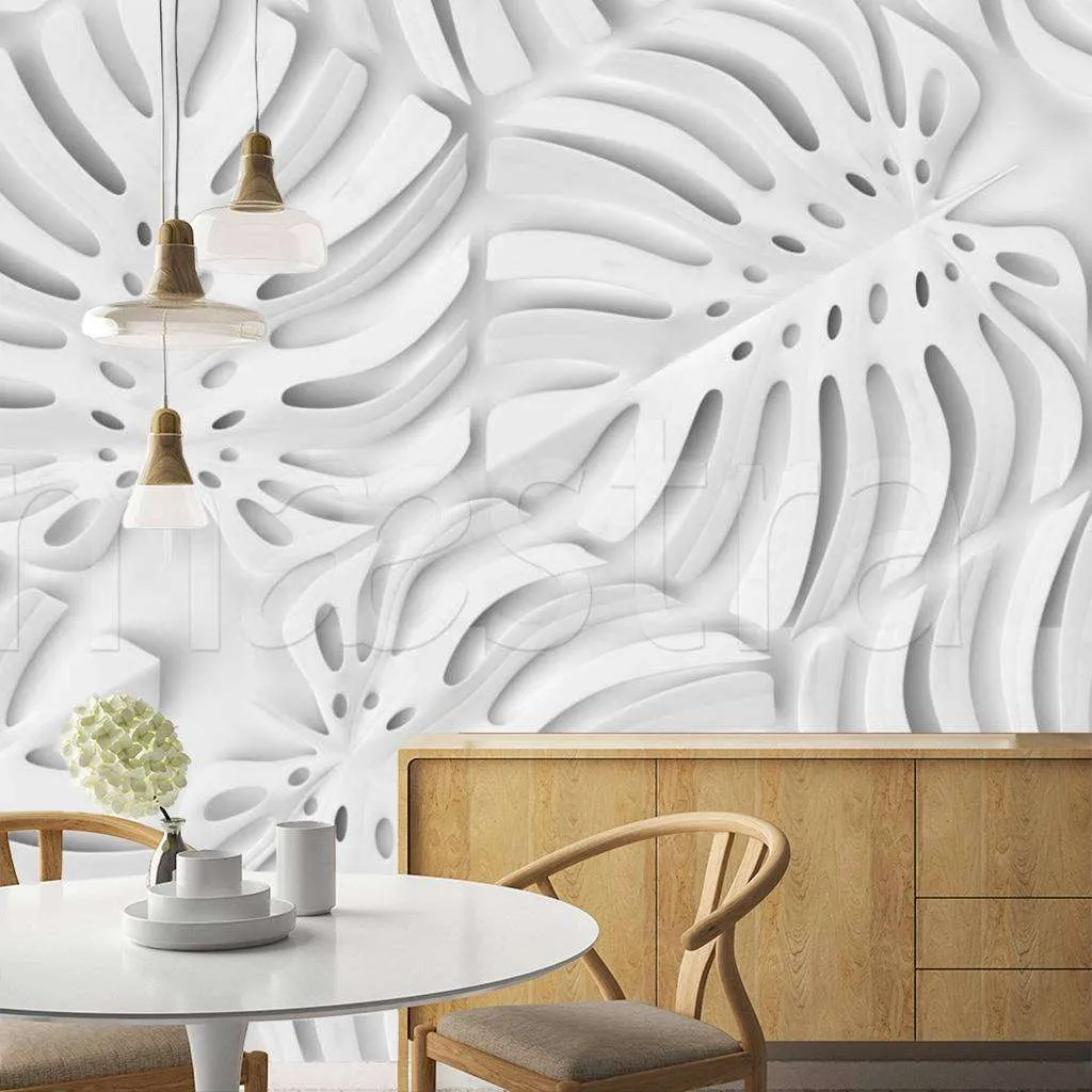 Бесшовные обои на стену: 3д листья папоротника из лепнины. Артикул: 10-476