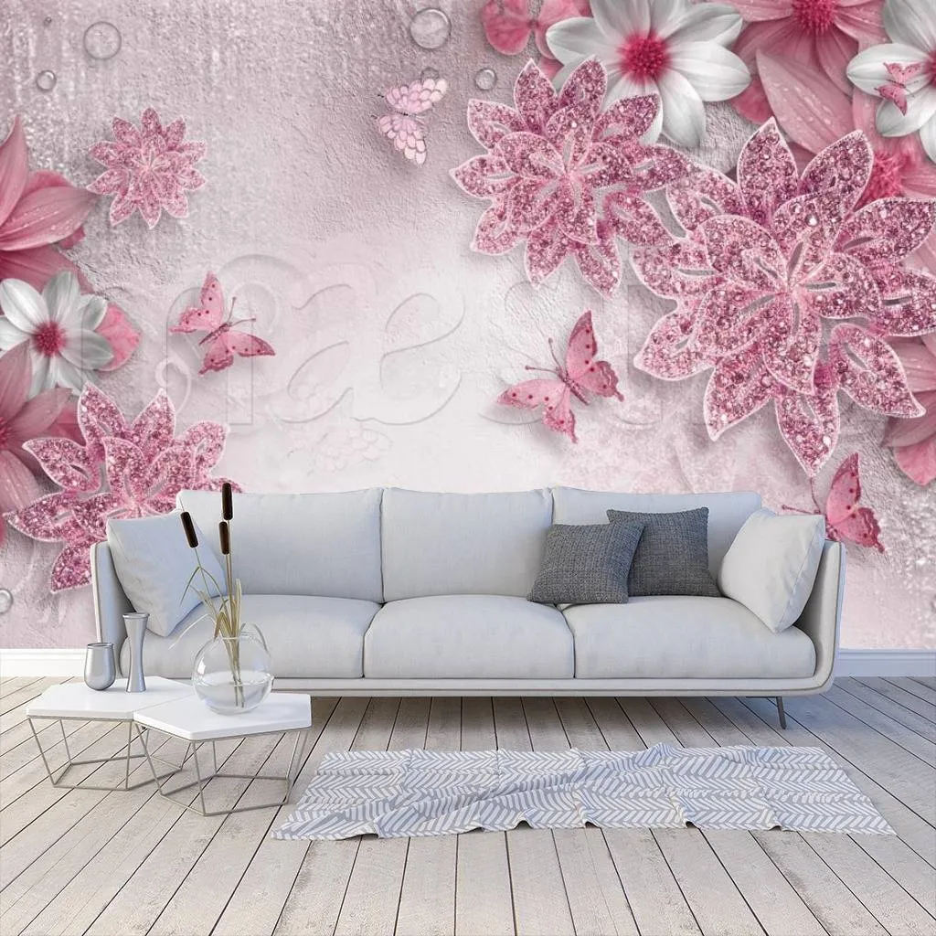 Бесшовные обои на стену: 3д цветы со стразами на розовом цвете. Артикул: 10-486