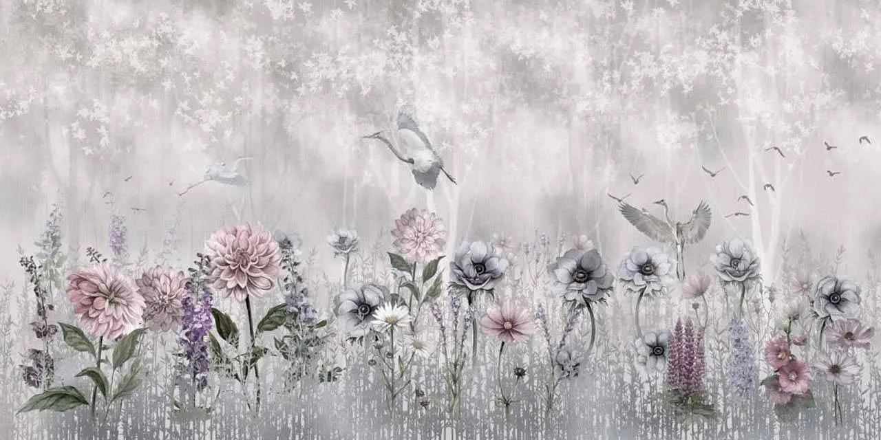 Бесшовные обои на стену: Журавли летят над цветами. Артикул: 7-604
