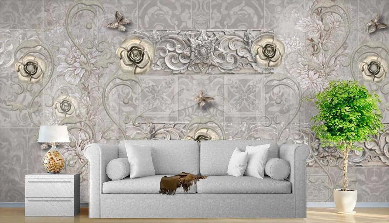 Бесшовные обои на стену: 3д узоры с цветами и бабочками. Артикул: 7-605