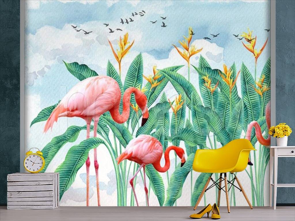 Бесшовные обои на стену: Фламинго в листьях. Артикул: 15-517