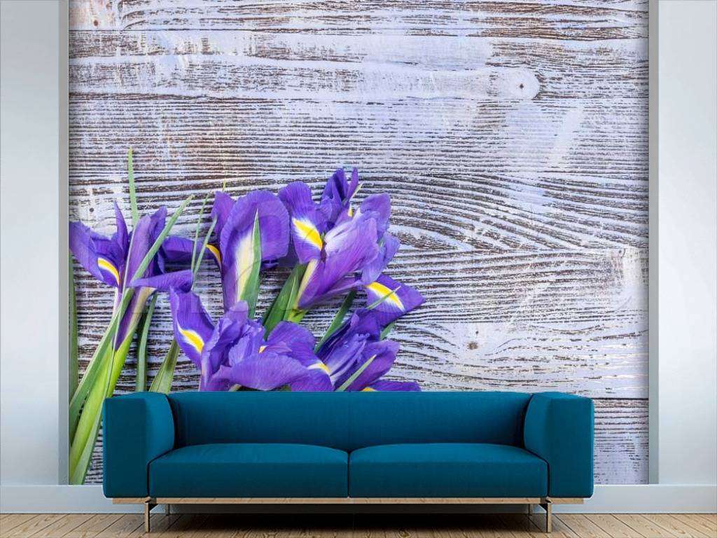 Бесшовные обои на стену: Букет ирисов на деревянном столе. Артикул: 10-010