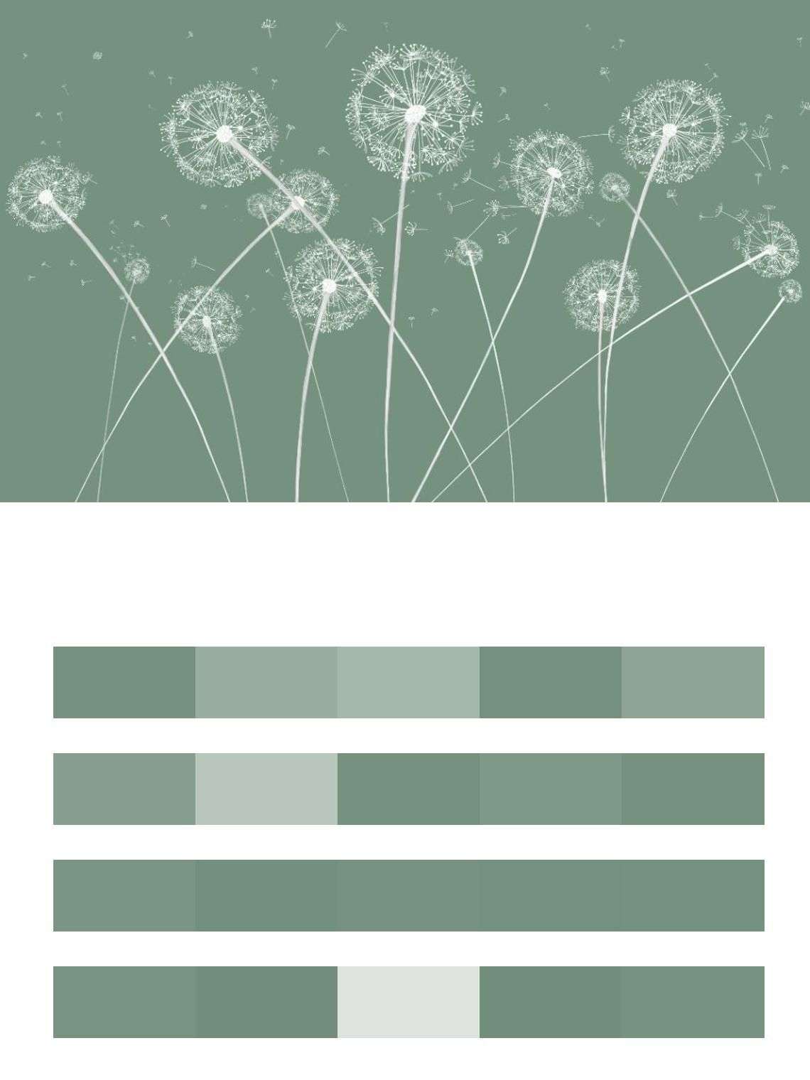Бесшовные обои на стену: Одуванчики на зелёном фоне. Артикул: 14-526
