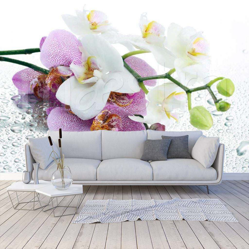 Бесшовные обои на стену: Ветка розовой орхидеи и капли воды. Артикул: 4-016