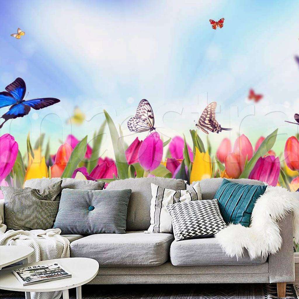 Бесшовные обои на стену: Цветы тюльпаны и бабочки. Артикул: 4-091