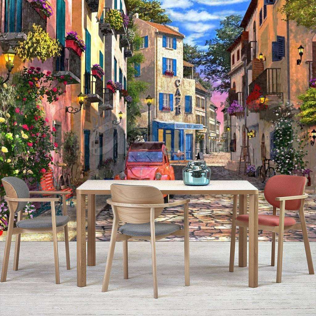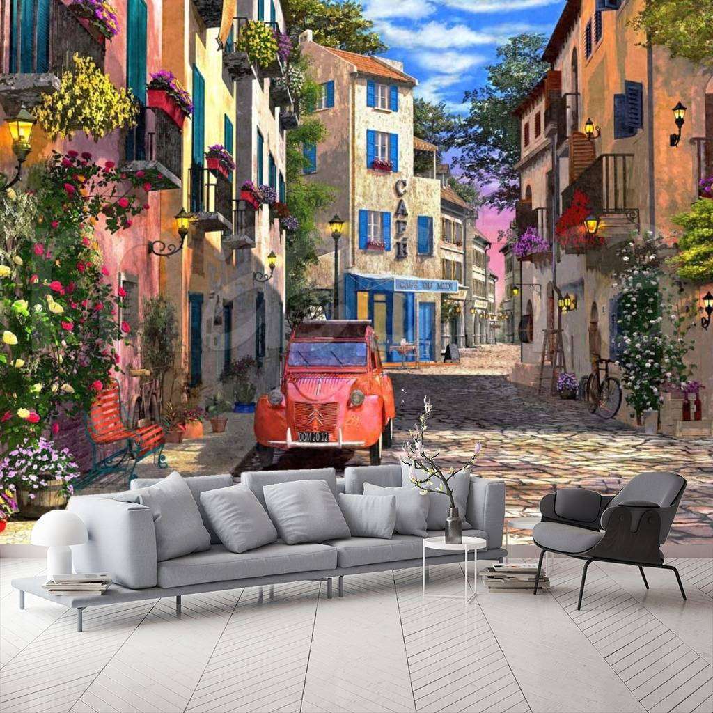 Бесшовные обои на стену: Красное авто на старинной улочке. Артикул: 8-032