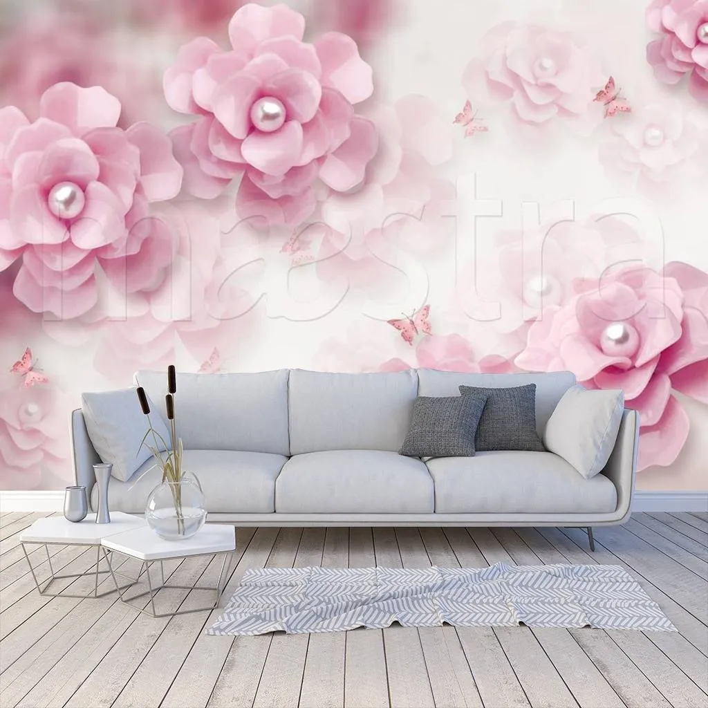 Бесшовные обои на стену: 3д розовые цветы на белом фоне. Артикул: 10-514