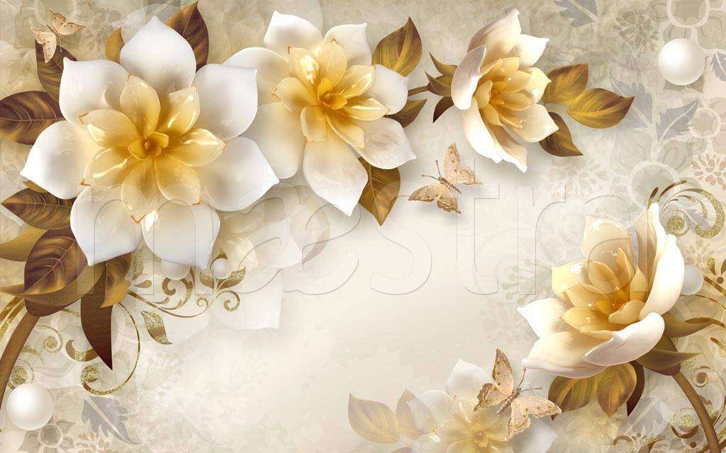 Бесшовные обои на стену: 3д цветы на желтом фоне. Артикул: 10-519