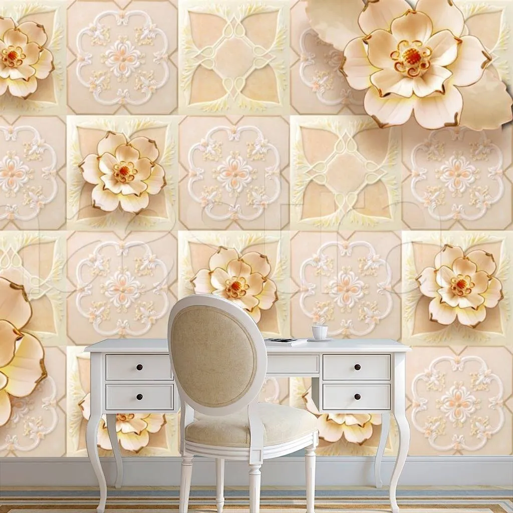 Бесшовные обои на стену: 3д цветы в цветных квадратах. Артикул: 10-529